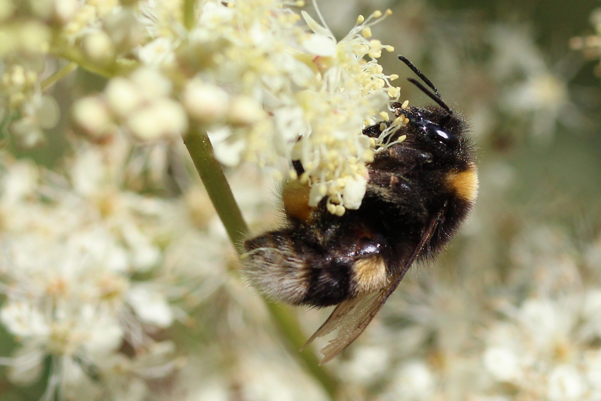 This white-tailed bumble bee was feasting on meadowsweet. I love its shining eyes, luxuriant hairiness and bulging pollen sacks. It was wonderful to see so many insects that morning thriving in the warm sunshine and abundance of food.